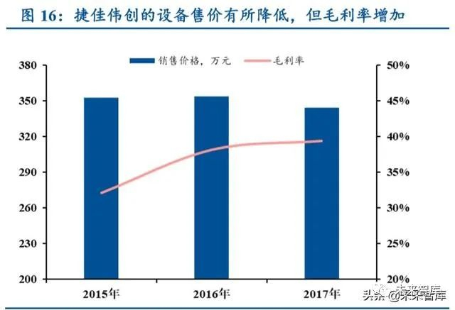 捷佳伟创管式二合一 PECVD 设备得到电池巨头认可。通威太阳能在 2018 年专业电池 厂商产能排名中居首,2019 年 4 月,通威成都四期 3.8GW 的高效晶硅电池项目进行招标, 捷佳伟创以管式氧化铝二合一设备竞标,虽然德国设备厂商 CT 在招标结束后告知通威,其 或与捷佳伟创有专利纠纷,但捷佳伟创以其专利文件证明设备的自主权利,最终成功获得通 威超过 4 亿的设备采购合同,订单金额折合 1.05 亿元/GW,同时,通威成都四期的 PERC 电池的背钝化工艺将全部选用捷佳伟创管式 PECVD 氧化铝二合一设备。捷佳伟创 PECVD 设备,有效证明了其在 PERC 增量市场中,获取大量市场份额的能力。