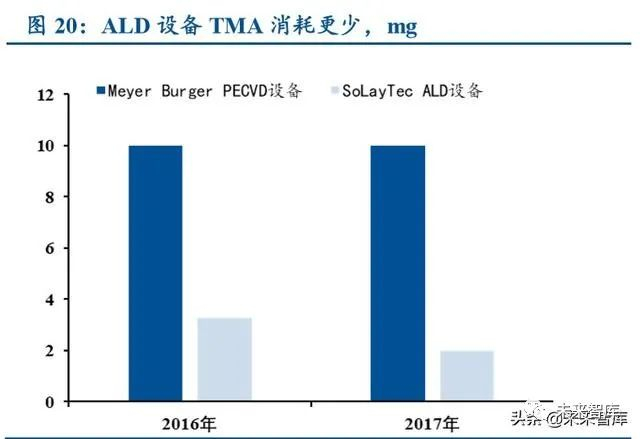 ALD 设备虽然市场份额有限,但或是未来降本提效的方向所在。尽管 PECVD 设备长期占据 市场的主流地位,但 ALD 设备的优势也同样明显:1)每小时的硅片吞吐量高于 PECVD,电池 摊销的单位固定成本更低;2)可以精控薄膜厚度,成膜质量更好;3)前驱体材料 TMA 消耗更 少,可减少运营成本。因此,在优化 PERC 电池效率,压缩前运营成本的背景,ALD 设备有望成 为新一代的背钝化设备,抢占更多市场份额。