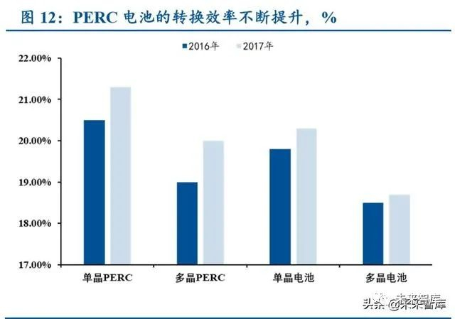 PERC 电池的转换效率不断提高。2016 年至 2017 年,单晶 PERC 电池的平均转换效率为 20.5/21.3%,与传统单晶电池相比,效率提升为 0.7/1%。同时,单晶 PERC 电池的最高转换效率 不断刷新,2015 年至 2017 年,最高转换效率分别为 22.13/22.61/23.45%,转换效率的差异显著分 布于行业的头部和尾部厂商之间。