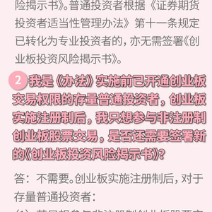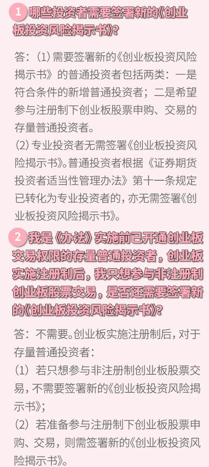 也就是说,创业板实施注册制后,作为“老投资者”,要参与打新,要交易注册制下的创业板股票的话,您得再签一份风险揭示书。