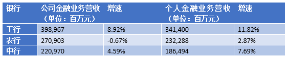 大型银行分部业务营收增长情况(注:建行只披露了分部业务利润未披露营收)