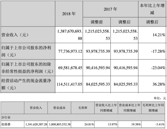 上市第二年,意华股份业绩继续呈现增收不增利的状态,且净利下滑幅度增大。2018年年报显示,公司实现营业收入13.88亿元,较上年同期增长14.21%;实现归属于上市公司股东的净利润7773.70万元,较上年同期减少17.28%;实现归属于上市公司股东的扣除非经常性损益的净利润6958.17万元,较上年同期减少23.04%;经营活动产生的现金流量净额为1.15亿元,较上年同期增长36.28%;主营业务连接器的毛利率为24.81 %,较上年同期减少3.41个百分点。