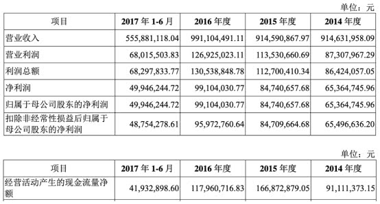 据招股说明书,2014年至2016年,公司实现营业收入分别为9.15亿元、9.15亿元、9.91亿元,实现归属于母公司股东的净利润分别为6536.47万元、8474.07万元、9910.40万元,实现扣除非经常性损益后归属于母公司股东的净利润分别为6549.66万元、8470.97万元、9597.28万元,经营活动产生的现金流量净额分别为9111.14万元、1.67亿元、1.18亿元;公司主营业务综合毛利率分别为26.49%、28.93%、30.51%。