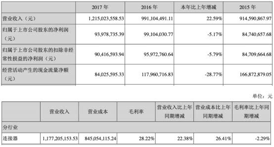 上市首年,意华股份净利润便出现了下滑。2017年年报显示,公司实现营业收入12.15亿元,较上年同期增长22.59%;实现归属于上市公司股东的净利润9397.87万元,较上年同期减少5.17%;实现归属于上市公司股东的扣除非经常性损益的净利润9041.66万元,较上年同期减少5.79%;经营活动产生的现金流量净额为8402.56万元,较上年同期减少28.77%;主营业务连接器的毛利率为28.22%,较上年同期减少2.29个百分点。