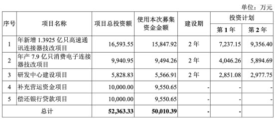 中国经济网记者查询意华股份上市时披露的公告书显示,公司上市发行股份数量为2667万股,募集资金总额为5.52亿元,扣除发行费用后募集资金净额为5.00亿元,分别用于“年新增1.3925亿只高速通讯连接器技改项目”、“年产7.9亿只消费电子连接器技改项目”、“研发中心建设项目”、“补充营运资金项目”、“偿还银行贷款项目”。