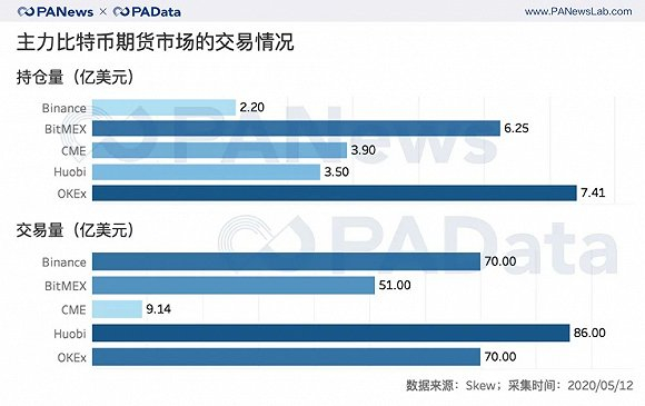 从持仓量来看,截至5月11日,OKEx的期货持仓量达到了7.41亿美元,BitMEX的期货持仓量达到了6.25亿元美元,OKEx已超越BitMEX成为全球持仓量最大的期货市场。实际上,根据Skew的统计,自今年4月12日以来,OKEx的期货持仓量就超过了BitMEX,成为全球最大的期货市场。除这两者之外,期货持仓量较大的市场还有CME、Huobi和Binance,其持仓量都超过了2亿美元。
