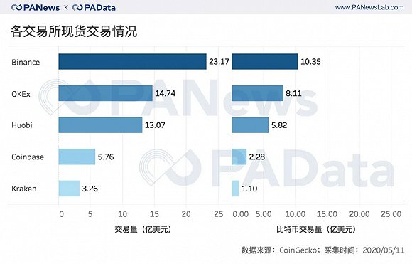 现货交易是交易所的核心业务和基础业务。根据CoinGecko的统计,截至5月11日,Binance、OKEx、Huobi、Coinbase、Kraken是24小时现货名义交易量最高的五家交易所。其中,Binance、OKEx和Huobi三大交易所的单日现货名义交易量均突破了10亿美元,Binance以23亿美元的日交易量居于榜首。
