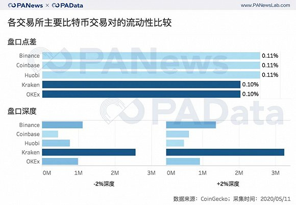 对交易所而言,把握住头部主流资产就相当于把握住了整个市场,主力BTC交易对的盘口流动性是交易所流动性的风向标。点差(Spread)是衡量流动性的另一个重要指标,点差越小意味着撮合可能越高,交易成本越低,流动性越好。从点差来看,五家交易所主力BTC交易对的点差都很小,相比而言,OKEx和Kraken更小,仅为0.10%,这在一定程度上说明这两家交易所的主力BTC交易对盘口流动性更胜一筹。