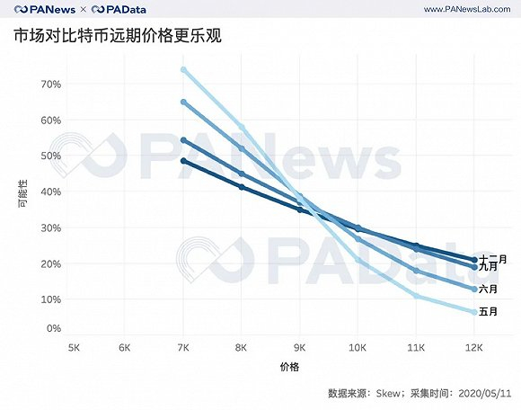 不过与主力市场交易方向不同的是,投资者对中远期比特币价格的走势相对乐观。至5月20日,市场认为比特币突破10000关口的可能性仅为21%,但从中远期来看,市场认为比特币突破10000美元的可能性提高到了30%(9月20日)和29.6%(12月20日)。而且从远期来看,市场认为比特币价格突破12000美元的可能性高于20%。