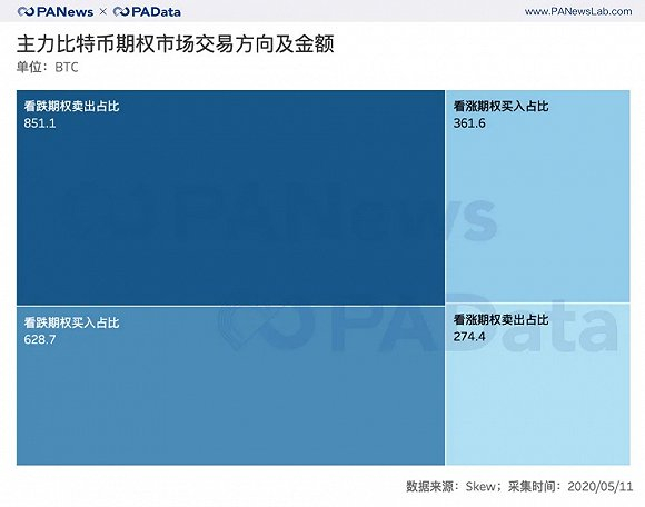 在Deribit和OKEx这两个主力比特币期权市场中,目前,看跌期权的买卖总额高于看涨期权的买卖总额。交易额最高的是卖出看跌期权,其交易金额约为851.1个BTC,占统计当天总交易额的40%左右,其次是买入看跌期权,交易额占比约为30%左右。