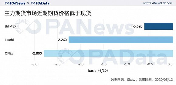 从OKEx、BitMEX和Huobi三大市场的短期期货基差来看,三大市场都呈现出短期现货价格低于期货价格的趋势,其中BitMEX上至6月20日的Basis为-0.62,OKEx则为-2.8。