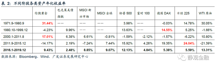 如表2及图13-17所示,无论是上涨阶段还是调整阶段,1971-2015年间,黄金走势跟发达经济体的权益资产总是跷跷板关系。背后依然是通胀周期的影响:高通胀提振黄金、抑制权益资产;低通胀抑制黄金、提振权益资产。2016-2019年间,黄金与欧美日各国权益资产均为正收益。在低通胀低利率环境下,股票与黄金的跷跷板关系看似已经消失,实则是支点发生了变化。
