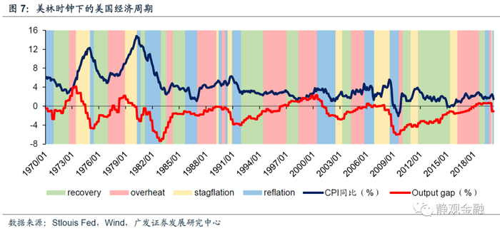 如图7所示,我们用美国产出缺口和CPI划分美林时钟下的美国经济周期。在美元计价黄金的前两轮牛市(上世纪70年代与2000-2011年间),美国频现经济滞胀。滞胀买黄金有三点原因: