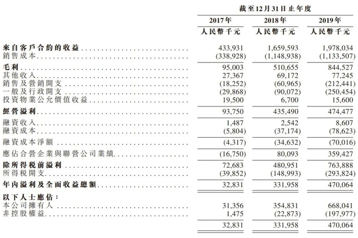 截至2019年12月31日止三个年度,物业开发及销售收益分别为人民币433.9百万 元、1659.6百万元及1978百万元,复合年增长率为113.5%;净利润分别为32.8百万元、人民币332百万元及人民币470.1百万元,复合年增长率为278.6%。