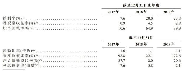 负债率方面,2017年、2018年及2019年12月31日的资产负债比率分别为98.8%、122.1%及172.6%。