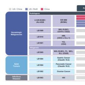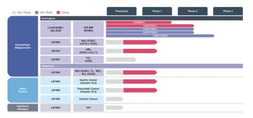 除LCAR-B38M / JNJ-4528外,传奇生物其他管线也在进行中,都是处于临床早期的自体候选组合,针对各种癌症,包括非霍奇金淋巴瘤NHL、急性髓细胞性白血病AML及T细胞淋巴瘤TCL ,前两项已在中国启动了I期临床试验。公司还开发了治疗NHL的靶点为CD20同种异体CAR-T候选药物,也进入了I期临床。另外还有多种针对实体瘤、传染病的临床前和临床阶段的多种在研产品。
