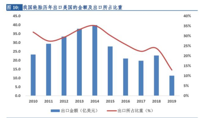 “双反”政策后,中国轮胎出口美国比重持续降低。截至2019年,国内出口至美国的轮胎数量下降至不足4000万条,出口金额也仅为11.32亿美元,较2014年时期下降了200%以上,出口美国金额占比降至不足13%。