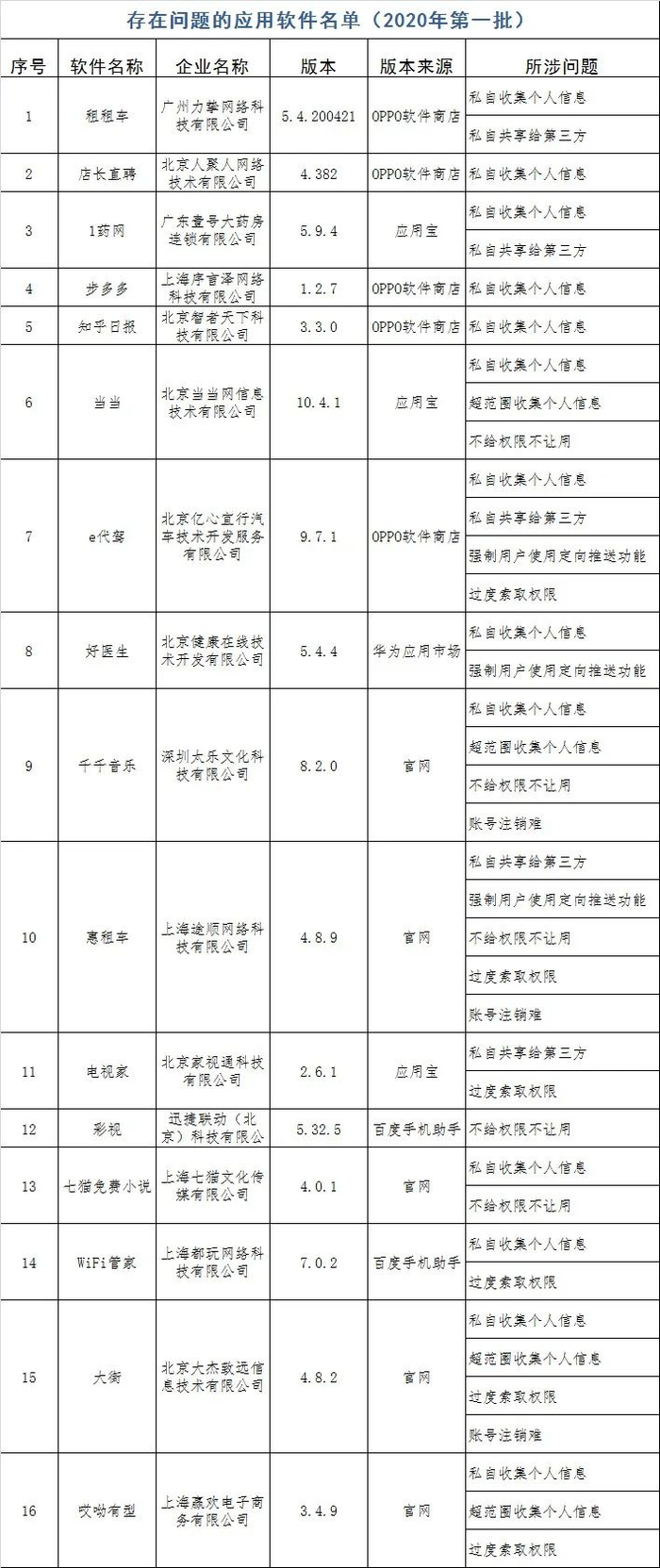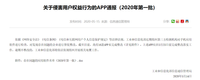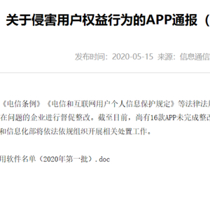 5月15日,工信部网站发布了《关于侵害用户权益行为的APP通报(2020年第一批)》。通报显示,依据《网络安全法》《电信条例》《电信和互联网用户个人信息保护规定》等法律法规,工信部近期组织第三方检测机构对手机应用软件进行检查,对发现存在问题的企业进行督促整改。
