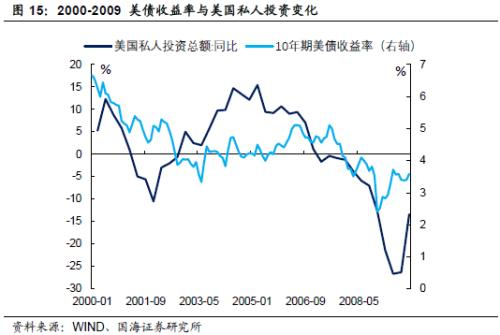 第一阶段为2002年至2003年上半年。此时美国经济已经企稳复苏,私人投资同比恢复正增长。但在过度宽松的货币环境下,实体经济的资金需求仍较弱,不足以推动收益率回升,使得美债延续了互联网泡沫危机以来的牛市。