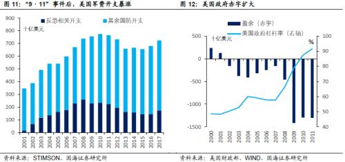 财政政策方面,互联网泡沫破裂后,共和党小布什政府延续了80年代同为共和党的里根政府的财政路线,一方面削减税率,将个人所得税最高税率由39.6%下调至35%。另一方面加大支出,补贴购房人群以抵御经济衰退。特别是2001年“9·11”事件之后,美国相继出兵阿富汗与伊拉克,又给美国政府增添了沉重的军费负担。其结果是克林顿政府节省的财政盈余被布什政府消耗殆尽。