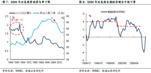 2000年互联网泡沫破灭后,美国的科技投资进入低谷,驱动“新经济时代”美国经济中高速增长的主要动力消失。互联网的传播速度放缓,导致技术更新对于生产效率的促进作用随之消退。除科技退潮的因素外,21世纪初美国也面临人口老龄化的困扰,同样对长期经济增长速度产生了负面影响。