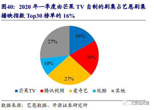 推行工作室模式,爆款综艺制作逻辑有望复刻至剧集。公司推行工作室模式,给予工作室充分自主性,可全面参与项目的策划、把关与成本预算等,以锻炼资源组织和项目驾驭能力。根据公司2019年年报,公司全资子公司快乐阳光共拥有16个综艺制作团队,芒果TV“自有+外部”影视工作室达15个。在此基础上,公司形成了打造爆款IP的专业化路径。在立项方面,由工作室提交节目提案,由经营管理委员发起立项,再由总经理办公室全面审核评估,以确保节目从立项之初就具备爆款潜质。在制作方面,题材紧跟社会热点,嘉宾国民认可度高,节目轻剧本、重真实互动,后期以细节调动情感共鸣,宣发善用社交媒体。我们判断,依靠爆款综艺制作经验,公司有望将体系化、工业化的综艺制作路径复刻至影视剧集制作,从而打造芒果出品“综艺”+“剧集”双品牌,实现核心内容全自制的影视制作生态闭环,有效提高爆款几率。根据艺恩数据,在2020年一季度艺恩综艺播映指数Top30榜单中,由芒果TV自制的综艺占比为20%;集播映指数Top30榜单中,由芒果TV自制的剧集占比为16%,较2019年一季度提升13pcts,自制剧集实力已经显现。