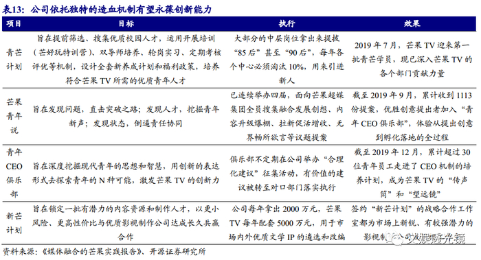 依托独特造血和激励机制,激活人才创新活力。在造血机制方面,积极推进人才制度改革,实行校招人才培养机制“青芒计划”,从名校选拔新鲜血液;连续举办四届“芒果青年说”,挖掘青年的创意新声;建立“青年CEO俱乐部”,孵化优秀创意;执行“新芒计划”,锁定有潜力的内容制作公司。在激励机制方面,公司采用创新激励、收益激励、绩效激励、竞争激励、岗位激励等方式驱动人才。设立专项创新奖金,鼓励团队创新;将日活点击、广告收入、会员收入等纳入奖励体系,激励优质内容生产;将员工绩效与组织绩效、公司整体目标关联,提高员工干劲;每年保持10%的中层干部淘汰比例,带动人才新陈代谢;开展中层管理竞聘上岗机制,内外并举、能者上位,保持人才活力。我们判断,依托独特造血和激励机制,公司能够激发人才创造力,源源不断涌现优质人才,为精品内容和IP矩阵蓄力。