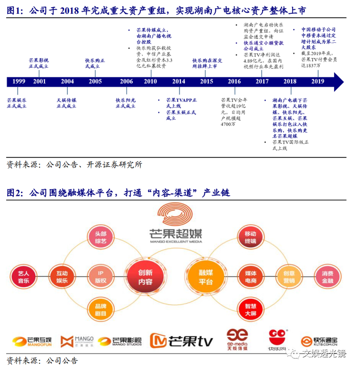 公司前身为快乐购物股份有限公司(简称“快乐购”)。快乐购成立于2005年,主营媒体零售业务,2015年1月于深交所上市。2018年6月,快乐购通过发行股份方式购买湖南广电旗下快乐阳光、芒果互娱、天娱传媒、芒果影视、芒果娱乐五家公司100%股权,完成重大资产重组,上市公司更名为芒果超媒股份有限公司,从“媒体零售平台”向“国有新型主流媒体集团”全面转型。重组后,公司以芒果TV为核心,依托强大的创意内容生产制作能力,建立起涵盖视频平台、影视综艺、游戏电竞、艺人经纪、音乐、电商金融、IP版权等的全产业链生态。