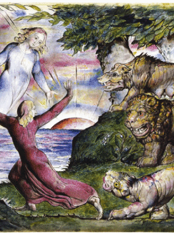但丁被豹、狮、狼三兽围困,它们分别代表着人性之淫欲、野心和贪欲;着蓝衣之人是但丁的老师——诗人维吉尔。