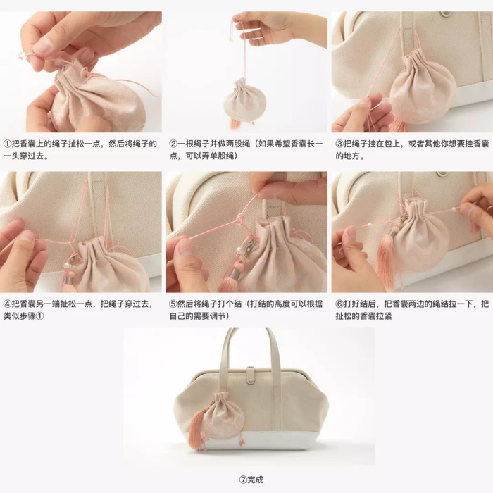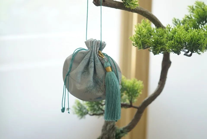 香囊大小适宜,可用以戴于腰间、肘下,也可配于包上。