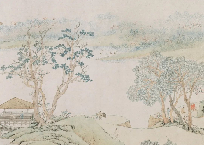 | 明·文徵明《江南春词意图卷》(局部)上海博物馆藏文徵明的《江南春词意图卷》笔意细秀、设色古雅,画中人悠游江南山水中,尽显文人心境。