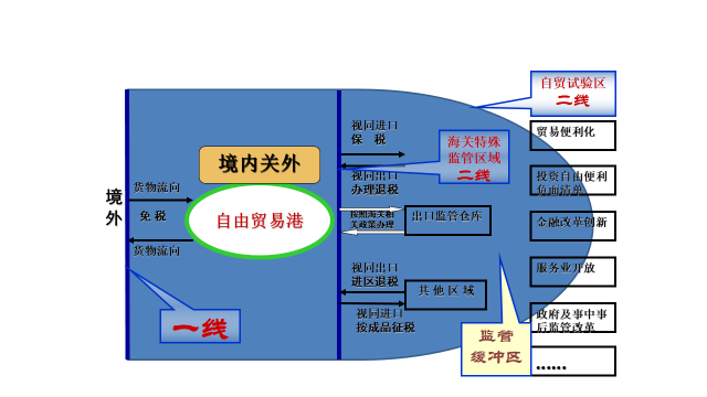 例如一线进出境径予放行、可在区内检疫;二线进出口单侧申报。区内不设账册,实施特殊的统计方式,区内自由流转,区间流转单侧申报。