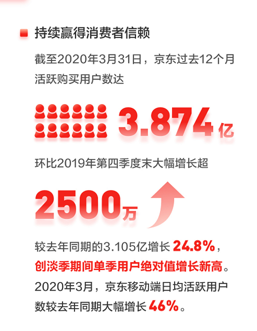 截至2020年3月31日,京东过去12个月的活跃购买用户数为3.874亿,较去年同期增长24.8%,这一增速较上一季度的18.6%提高超不止6个百分点。