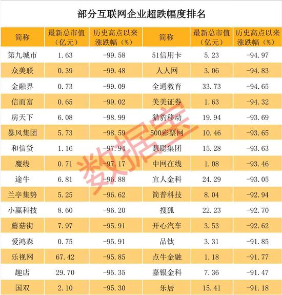 投资互联网企业高风险高回报。既有涨幅几十倍上百倍的公司,也有暴跌90%以上的公司。数据宝不完全统计显示,有30多家知名互联网公司最新价较历史最高价跌幅超90%。A股主要有乐视网、暴风集团和全通教育;港股主要有51信用卡、慧聪集团;美股则有人人网、途牛、搜狐等众多知名企业。