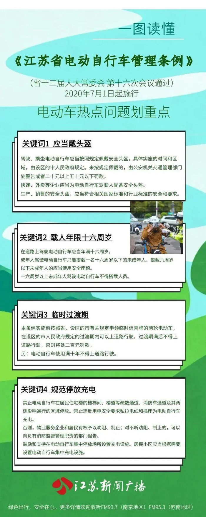 江苏省通过《江苏省电动自行车管理条例》,将于今年7月1日正式施行。该条例明确,电动自行车驾驶人和乘坐人应当佩戴安全头盔,否则将处警告或最高50元罚款。