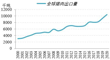 全球猪肉贸易量呈现逐年增长态势。2019年度全球猪肉出口量933万吨,占全年产量的9.2%。出口结构方面,欧盟、美国、加拿大是主要的猪肉出口国,2019年出口量分别为355万吨、287万吨以及128万吨,三国出口合计占比82.5%。