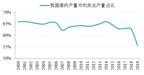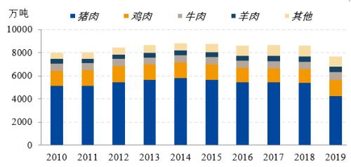 中国肉类消费结构以猪肉和鸡肉作为主要消费品种,牛肉及羊肉作为补充,猪肉消费量占中国总体肉类需求的一半以上。2019年中国肉类总产量7649万吨,其中猪肉产量4255万吨,鸡肉产量1375万吨,牛肉产量667万吨,羊肉产量488万吨。分别占比55.6%、18%、8.7%以及6.4%,其他肉类占比11.3%。