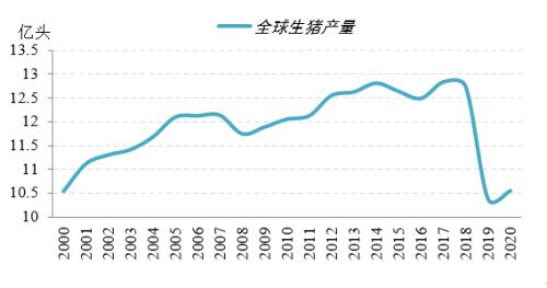 根据美国农业部统计数据,全球生猪年产量接近10亿头。受非洲猪瘟影响,2019年度全球生猪产量从上年度12.7亿头大幅下滑至10.4亿头,预计2020年度全球生猪产量10.5亿头。
