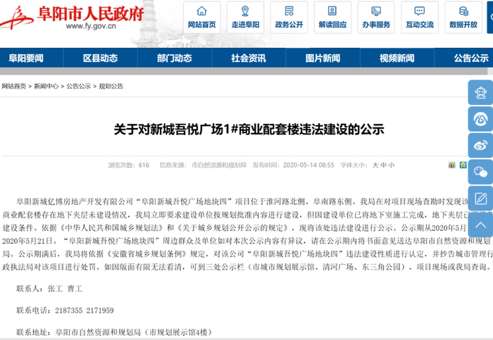 2020年5月14日,阜阳市人民政府网发布由阜阳市自然资源和规划局出具的《关于对新城吾悦广场1#商业配套楼违法建设的公示》。公示信息显示,阜阳新城亿博房地产开发有限公司“阜阳新城吾悦广场地块四”项目位于淮河路北侧、阜南路东侧。阜阳市自然资源和规划局在对项目现场查勘时发现该项目1#商业配套楼存在地下夹层未建设情况,阜阳市自然资源和规划局立即要求建设单位按规划批准内容进行建设,但因建设单位已将地下室施工完成,地下夹层已不具备建设条件。依据《中华人民共和国城乡规划法》和《关于城乡规划公开公示的规定》,现将该处违法建设进行公示。公示期满后,阜阳市自然资源和规划局将依据《安徽省城乡规划条例》规定,对该公司“阜阳新城吾悦广场地块四”违法建设性质进行认定,并抄告城市管理行政执法局对该项目进行处罚。