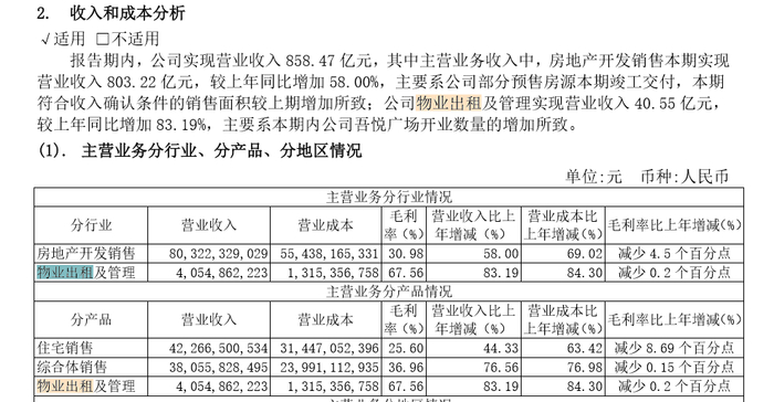 值得注意的是,新城控股在销售及管理费用方面水涨船高,2019年全年,新城控股物业出租及管理费用上涨至84.30%,年报解释称系新开业吾悦广场的增加导致的成本增加。