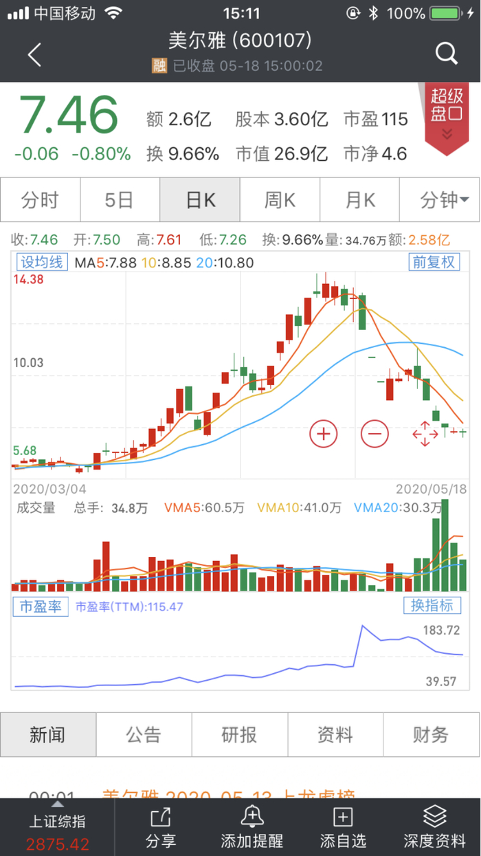 今日美尔雅再次收出阴线,这距离4月22日的股价年内高点14.38元/股已经接近腰斩。从4月28日,股价连续3个跌停后打开,3个交易日后再次启动阴跌模式。