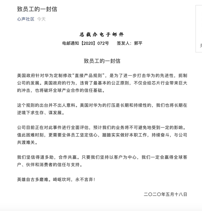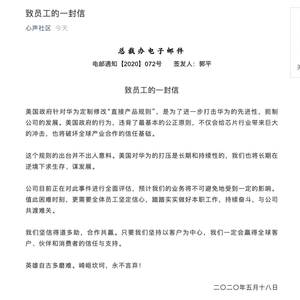5月18日,华为在心声社区发布一封由轮值董事长郭平签发的“致员工的一封信”。信中称,美国政府针对华为定制修改“直接产品规则”,是为了进一步打击华为的先进性,扼制公司的发展。美国政府的行为,违背了最基本的公正原则,不仅会给芯片行业带来巨大的冲击,也将破坏全球产业合作的信任基础。