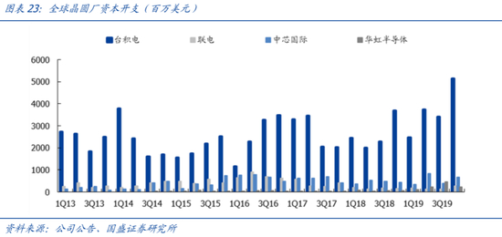Capex进入上行期,台积电、中芯国际纷纷增加资本开支。台积电率先推进大幅资本开资提升,推进先进制程应用。台积电2018年资本开支104亿美元,2019年提升会148亿美元,2020年预期150~160亿美元。中芯国际2019年资本开支22亿美元,预期2020年上升至31亿美元,进一步加码扩大42亿美元。