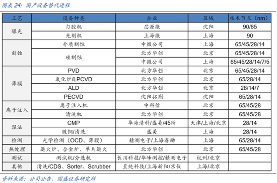 国内国产化逐渐起航,从0到1的过程基本完成。中微公司介质刻蚀机已经打入5nm制程。北方华创硅刻蚀进入SMIC 28nm生产线量产。Mattson(屹唐半导体)在去胶设备市占率全球第二。盛美半导体单片清洗机在海力士、长存、SMIC等产线量产。沈阳拓荆PECVD打入SMIC、华力微28nm生产线量产,2018年ALD通过客户14nm工艺验证。精测电子、上海睿励在测量领域突破国外垄断。