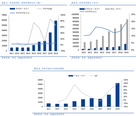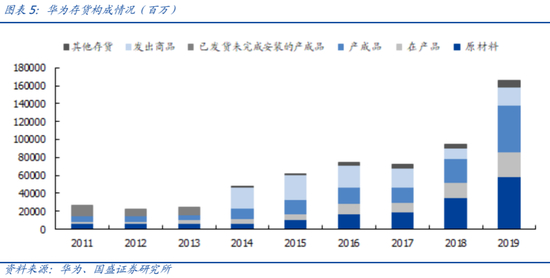 我们从产业及财报分析了解华为从去年开始就积极加大备货力度,并定期进行压力测试。从财报披露数据来看,19年报原材料同比增长65.1%至585.20亿人民币,原材料营收占比由4.9%提升至6.8%;产成品同比增长98.6%至522.4亿人民币;整体存货同比增长75.0%至1653.61亿人民币,存货营收占比由13.1%提升至19.3%。