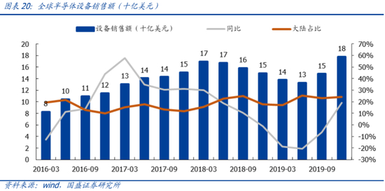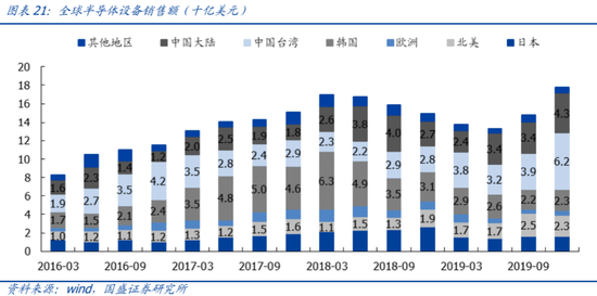 根据SEMI,2019Q4半导体设备销售额178亿美元,同比增长19%,环比增长24%,单季度半导体设备销售额创历史新高。按地区分布,贡献最大的分别是中国大陆(同比增长59%)、中国台湾(同比增长121%)。
