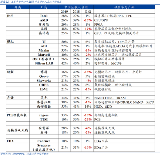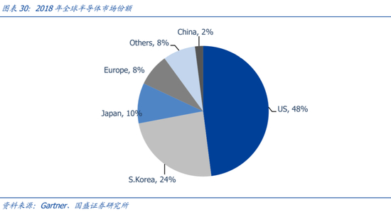 Gartner的数据表示,2018年美国半导体公司,包括IDM以及依赖独立铸造厂制造芯片的无工厂设计公司占据了约48%的全球半导体市场。根据美国国际贸易委员会的数据,半导体是2018年美国第四大出口产品,仅次于飞机、成品油和原油,中国是多家美国企业的最大消费市场,美国国内市场仅占全球半导体需求的25%不到。半导体行业分工明显,同时美系半导体厂商在华收入比重均在20%以上,部分超过50%。从中长期来看,若限制持续升级,美国半导体公司的全球份额或会降低,同时中国半导体公司积极发展,国产化全力推进,在全球半导体的地位有望大幅提升。