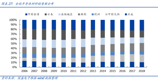 中国半导体材料需求巨大,产业持续东移,国产替代序幕缓缓拉起。从占比来看,半导体材料市场中,中国台湾依然是半导体材料消耗最大的地区,全球占比22.04%。中国大陆占比19%排名全球第三,略低于19.8%的韩国。然而中国大陆占比已实现连续十年稳定提升,从2006年占全球比重11%,到2018年占比19%。产业东移趋势明显。