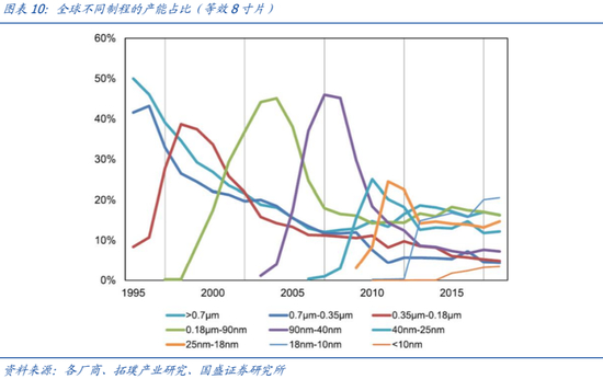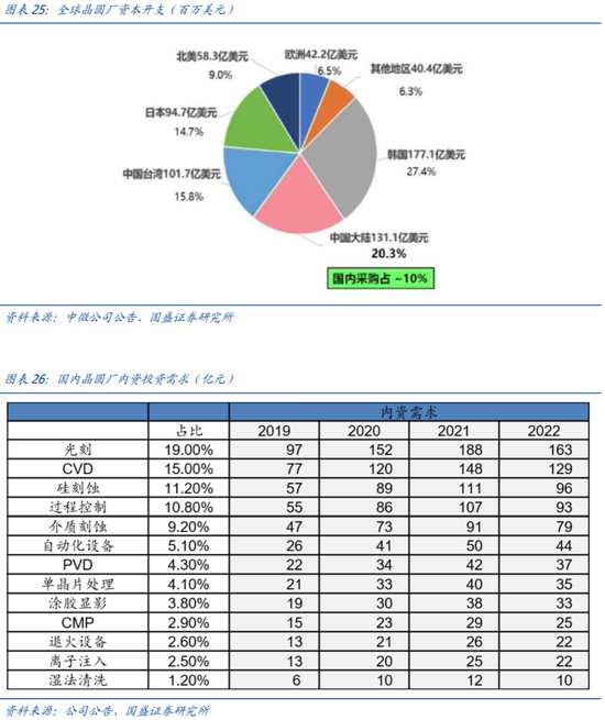 制程越高,设备投资额占比越高。设备投资一般占比70~80%,当制程到16/14nm时,设备投资占比达85%;7nm及以下占比将更高。光刻、刻蚀、沉积、过程控制、热处理等均是重要投资环节。