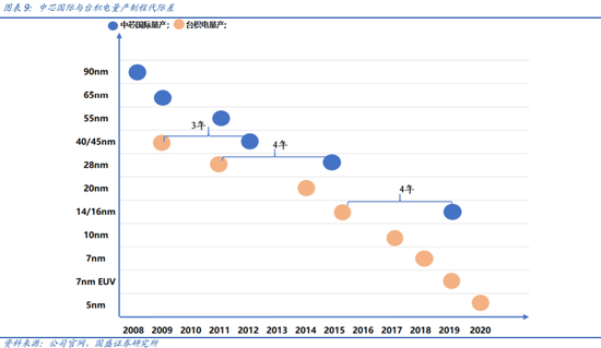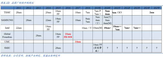先进制程呈现资金、技术壁垒不断提高的趋势,行业格局逐渐出清,SMIC是重要的先进制程追赶者。从制造环节而言,行业资金、技术壁垒极高,不仅十多年来没出现新的竞争玩家,而且随着制程分水岭的出现,越来越多的参与者从先进制程中“出局”。格罗方德在2018年宣布放弃7nm研发,联电在2018年宣布放弃12nm以下(即7nm及以下)的先进制程投资,因此保持先进制程研发的玩家仅剩行业龙头台积电、三星、英特尔等,以及处于技术追赶的中芯国际。